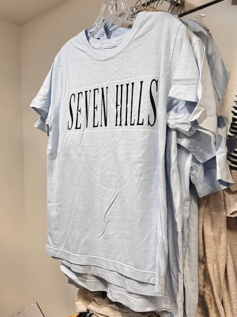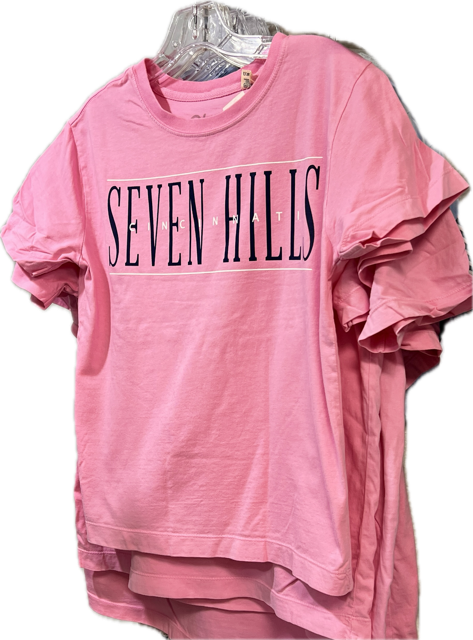 This youth tee shirt is made from soft cotton for comfortable wear. It features a pink and blue option and is screen printed with the Seven Hills logo. Designed for everyday use, it offers a simple and durable option for young wearers.